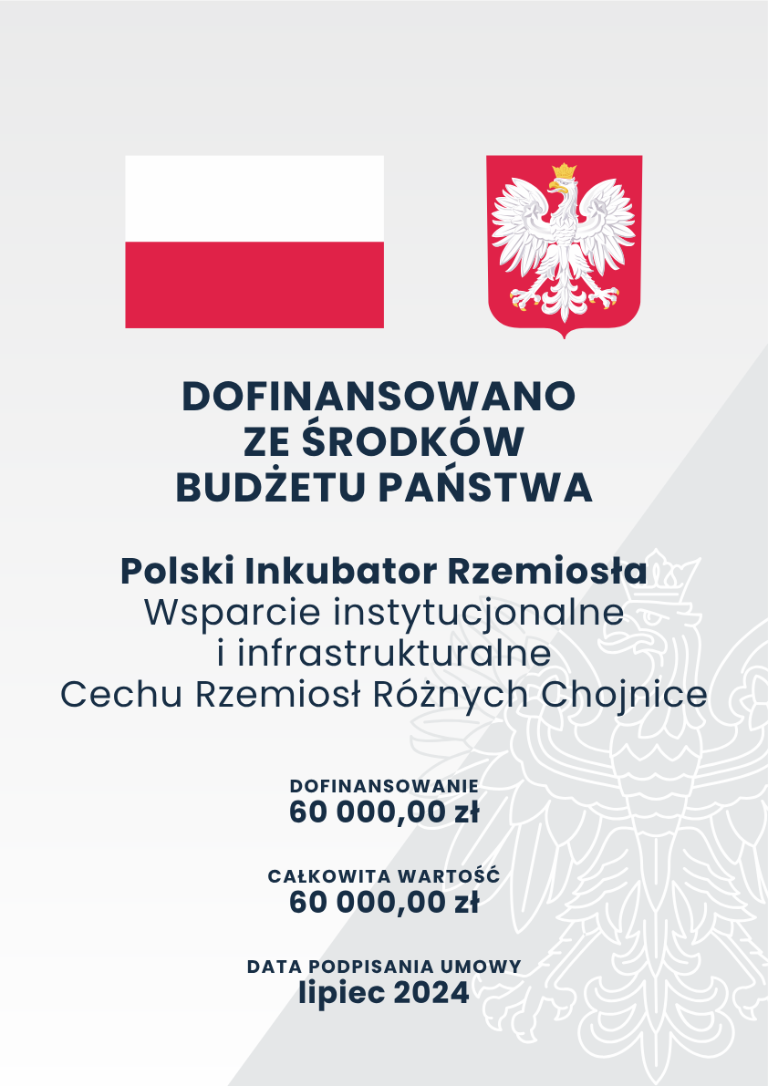 W dniu 2024-07-02 Cech Rzemiosł Różnych w Chojnicach podpisał z Narodowym Instytutem Wolności – Centrum Rozwoju Społeczeństwa Obywatelskiego umowę o dofinansowanie zadania pt. „Wsparcie instytucjonalne i infrastrukturalne Cechu Rzemiosł Różnych Chojnicach” realizowanego w ramach Rządowego Programu Polski Inkubator Rzemiosła na lata 2021-2030 r.